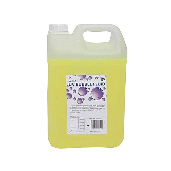Met deze hoge kwaliteit fluorescerende bellenblaasvloeistof voor gebruik in bellenblaasmachines maak je grote en stevige bellen. Door de UV gevoelige toevoeging lichten de bellen op onder UV licht voor een zeer speciaal effect. De vloeistof laat geen residu op kleding of meubilair achter en bevat geen stoffen die schadelijk zijn voor de gezondheid.