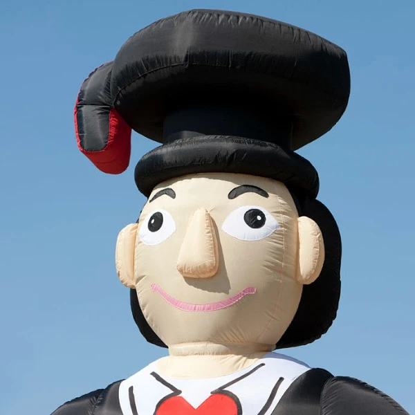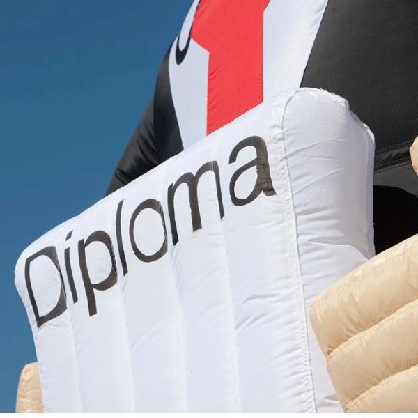 De opbouw en afbouw van deze pop is zo gefiktst. Dit is zeer eenvoudig om zelf te doen. Rol het pakket uit, aansluiten op de blower, stekker in het stopcontact en binnen één minuut staat de man er klaar voor! De stekker in het stopcontact of in de verlengkabel / haspel. De diploma man kan eenvoudig in elke ruime personenauto vervoerd worden. Soms is het noodzakelijk om de achterbank naar voren te klappen.