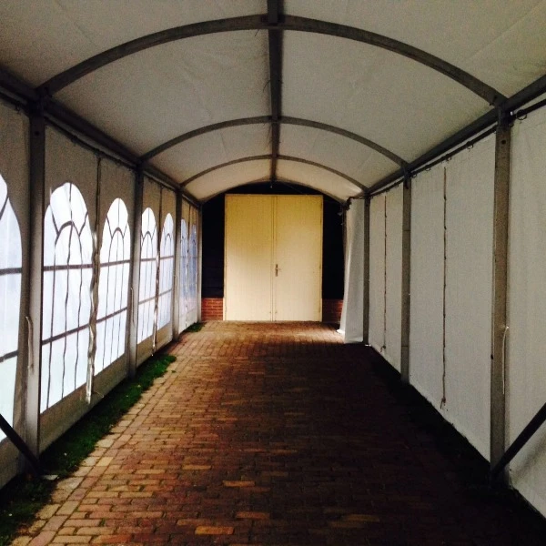Verder kunnen wij onze luifels ook koppelen aan onze aluhal tenten. Hierdoor kunt u bijvoorbeeld een aparte gang en/overkapping creëren van de tent naar een gebouw.