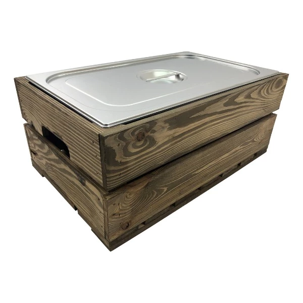 Deze mooie stevige kisten zijn geschikt ter decoratie of te gebruiken als presentatie voor je buffet in combinatie met de gastronorm inzetbakken van de chafing dish.