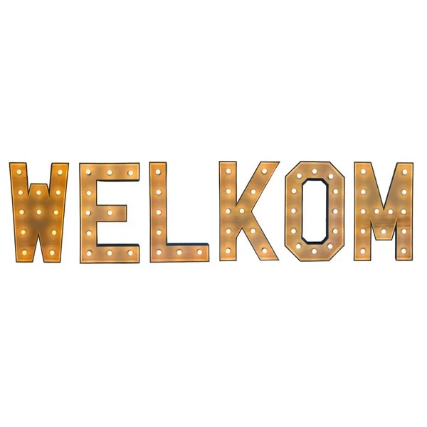 De WELKOM lichtletters. Deze lichtletters zijn de ultieme sfeermakers op jullie bruiloft! Geweldig als binnenkomer op jullie feest of mooi in het veld als achtergrond tijdens ceremonie, dinner of party. Simpel aan elkaar te koppelen en maar 1 stopcontact nodig.