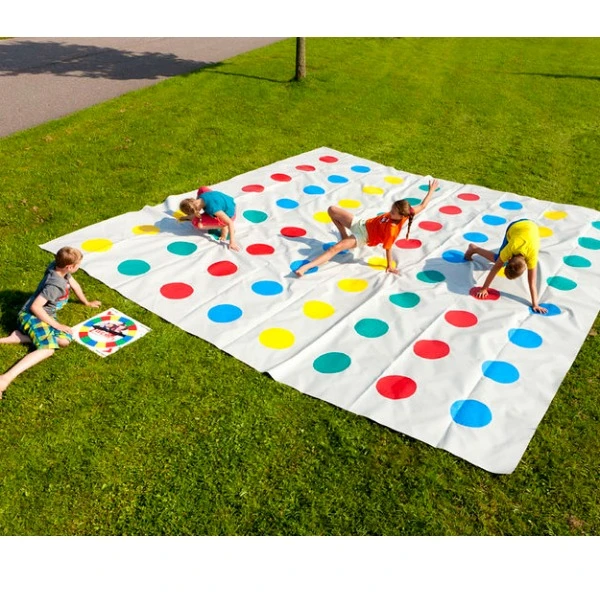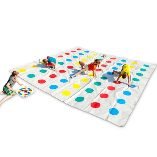 Een megagrote mat om Twister te spelen, geleverd samen met een speelbord. Een fantastisch spel om te spelen tijdens je zeskamp. Dit is een spectaculair spel, dat coördinatievermogen, incasseringsvermogen en conditie vraagt? Dan is deze extra grote Twistermat een geheide hit. Omdat er liefst 4 speelhoeken zijn bij deze XXL-versie van het populaire Twister, kun je met een grote groep tegelijkertijd dit spel spelen. De mat waar het hele spel op staat, is in totaal 5 bij 5 meter groot. Er is dus wel wat ruimte voor nodig om deze Twister te spelen.