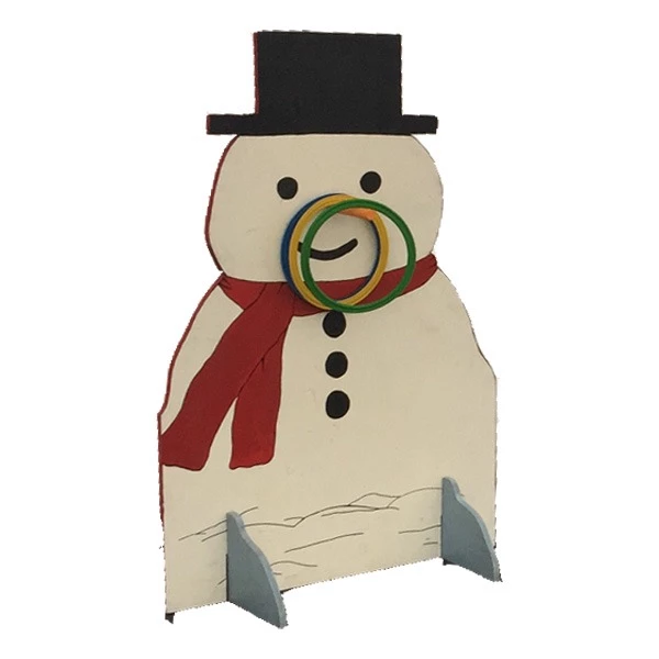 Drie pogingen. Werp de gekleurde ringen om de lange oranje neus van meneer de sneeuwman. Lukt het jou? Daag jezelf en anderen uit door te differentieren in de afstand. Vanaf welke afstand lukt het jou?