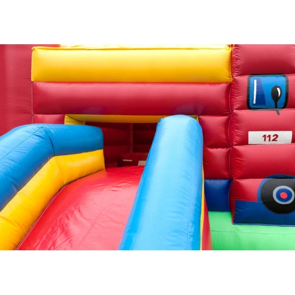 Wat een leuk springkussen in Brandweer thema. Doordat het springkussen overdekt is, kan het ook gebruikt worden op een regenachtige dag. Met de multifun Brandweer bezorg je de kinderen een fantastische dag! Springen, glijden, springen, glijden en ga zo nog maar even door. Gegarandeerd urenlang speelplezier op dit leuke springkussen! Dit springussen is er in twee uitvoeringen met en zónder obstakels. Deze kunnen niet meer voorkeur gereserveerd worden.