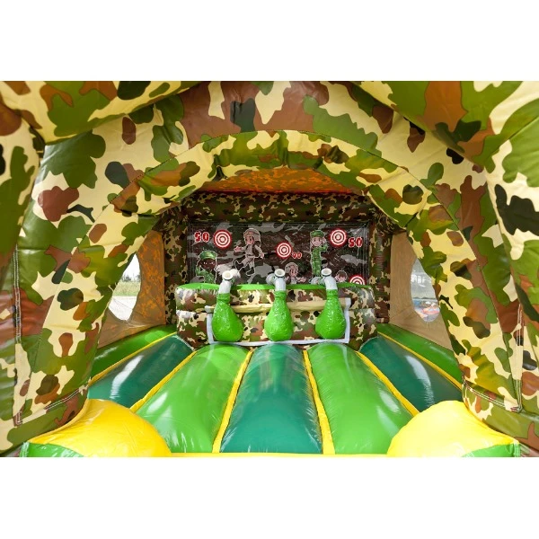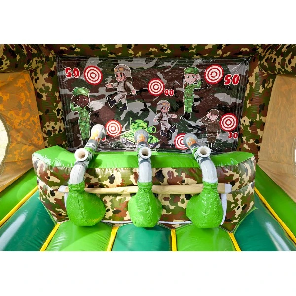 Bezorg kinderen de dag van hun leven met de shooter challenge met militair thema! De shooter challenge is een uniek ontwikkeld product! Deze inflatable heeft drie geïntegreerde luchtkanonnen die werken op de luchtdruk van het kussen. Op de achterwand is een target wall bevestigd. Schiet op de targets en behaal de meeste punten! Voor dubbel zoveel speelplezier heeft de shooter challenge maar liefst twee glijbanen. Zeker weten dat dit leuk gaat worden!