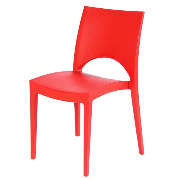 Trendy rode stoel gemaakt van 100% polypropyleen. Zeer geschikt als terrasstoel, maar wordt ook veel gebruikt als nette stoel op evenementen, zoals bijvoorbeeld een bruiloft of zakelijke partijen.
