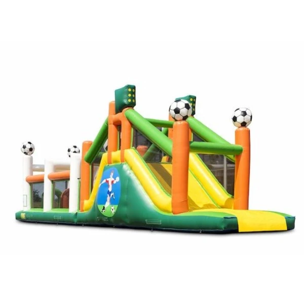Bezorg kinderen de dag van hun leven met deze unieke stormbaan met Voetbal thema! Wie van de twee spelers weet het snelste de obstakels te overwinnen, als eerste over de glijbaan te glijden en het einde van de baan te behalen? Spreek met het thema en de kleurrijke objecten jongens en meisjes aan en zorg voor urenlang speelplezier. Garandeer een actieve beleving met maar liefst 7 spelelementen verdeeld over een extra brede baan van 17,5 meter.