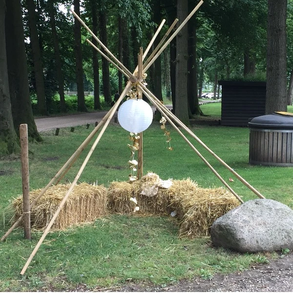 Funtionaliteit gecombineerd met een prachtige uitstraling! Drie strobalen gestyld met 7 bamboestokken in tipivorm, maken deze prachtige functionele eyecatcher op jouw buitenevenement of feestje. Leuk sfeertje toch?! Leuk op jouw bruiloft, festival of welke themafeest dan ook!