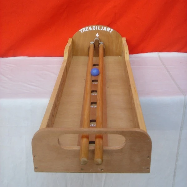 Leg de bal vooraan op de twee houten stokken. Beweeg de stokken langzaam naar rechts en weer naar links om de bal verder boven het spelbord te laten komen. Probeer de bal bij het gat met het hoogste puntental te laten vallen.