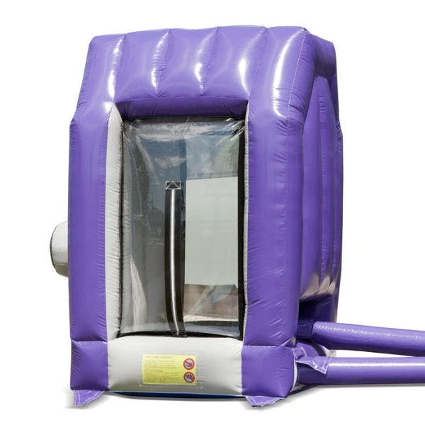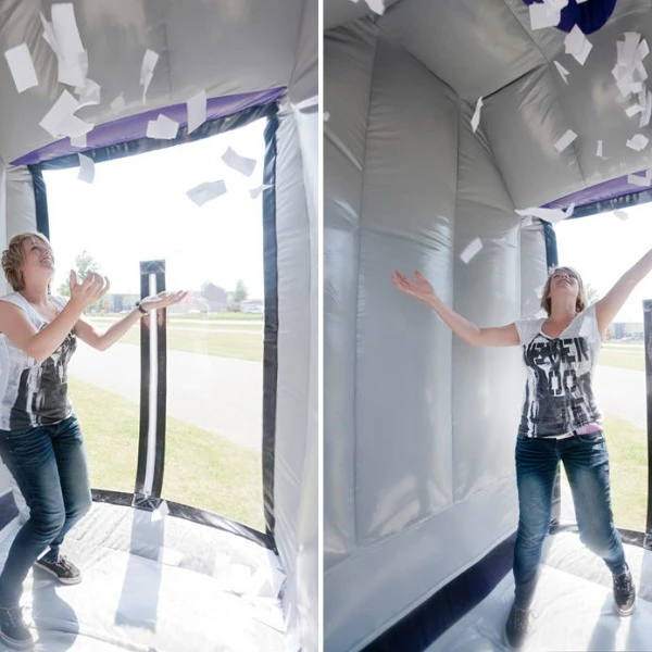 Wie vangt de meeste ballen in de wervelwindmachine? Deze attractie blaast lucht naar binnen, zodat de persoon die binnenin staat, zich in een wervelwind bevindt! Het doel van het spel is, dat de cabine gevuld wordt met ballen, en dat de kandidaat de ballen uit de lucht graait. Een hele leuk uitdaging! Je zet de opblaasbare wervelwindmachine gemakkelijk binnen 10 minuten op. Bijvoorbeeld tijdens een evenement of feestje. De wervelwindmachine wordt compact in één deel geleverd en is daardoor gemakkelijk te vervoeren.