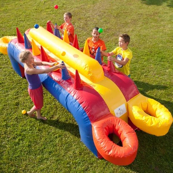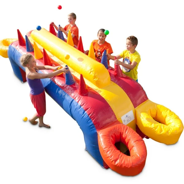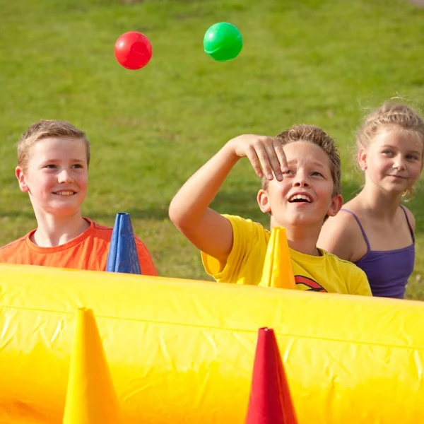 Een uniek spel: Zweefbal! Door de constante lucht uit de kegels blijven de ballen op de wind zweven. Het is de bedoeling om de bal van de ene kegel naar de andere kegel over te brengen, om het balletje vervolgens aan het eind in de mand te blazen. Wie lukt het om alle ballen, zonder ze te laten vallen, naar de andere kant over te brengen? Degene die als eerst al zijn ballen in de mand heeft, wint het spel. Leuk om in teamverband te spelen, maar het kan ook één tegen één. Laat die ballen maar vliegen!